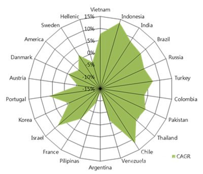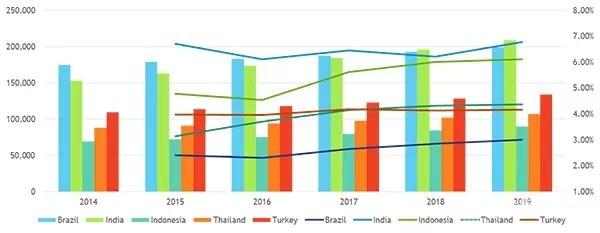 鈦白粉的市場需求變化情況與國家的宏觀經(jīng)濟環(huán)境變化的緊密相關,CCM花費了大量的時間和精力去尋找各國歷年變化的宏觀經(jīng)濟數(shù)據(jù),結(jié)合人均GDP、工業(yè)GDP產(chǎn)值、PMI指數(shù)、PPI指數(shù)、城鎮(zhèn)人口比例等大量數(shù)據(jù),經(jīng)反復篩選后以線性擬合的方式構(gòu)建了適用于發(fā)展中國家的鈦白消費量數(shù)據(jù)預測模型,并通過世界銀行,世界經(jīng)貿(mào)組織等對這些發(fā)展中國家的宏觀經(jīng)濟的預測,CCM成功發(fā)掘出五個未來的新興市場國家,分別是:土耳其,印度,巴西,泰國,印度尼西亞。其中,印度將成為需求增速最快的國家,2014年-2015年的需求數(shù)量將從15萬噸漲至21萬噸,巴西將從17萬噸漲至20萬噸,另外3個國家印度尼西亞,泰國以及土耳其的漲幅在2萬噸左右。