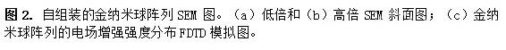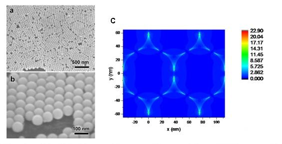 該研究團(tuán)隊(duì)在前期化學(xué)法獲得高產(chǎn)率、單分散、尺寸可控制備金納米八面體的基礎(chǔ)上,利用非聚焦激光束輻照誘導(dǎo)金納米八面體顆粒體相熔融和液相的快速冷卻,發(fā)展了一種簡(jiǎn)便、高效的制備方法,成功獲得了單分散的球形金納米顆粒;并通過氣/液界面自組裝技術(shù)構(gòu)筑了單層有序金納米顆粒陣列,該有序金納米顆粒陣列表現(xiàn)出好的電磁場(chǎng)增強(qiáng)效應(yīng),在生物傳感方面有重要的應(yīng)用。
