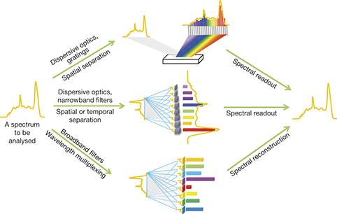 不同光譜儀工作原理比較圖。(最上面是目前最廣泛采用的光柵光譜儀的原理;最下面是量子點光譜儀的原理;中間為現(xiàn)有多數(shù)其他光譜儀技術(shù)原理。)
