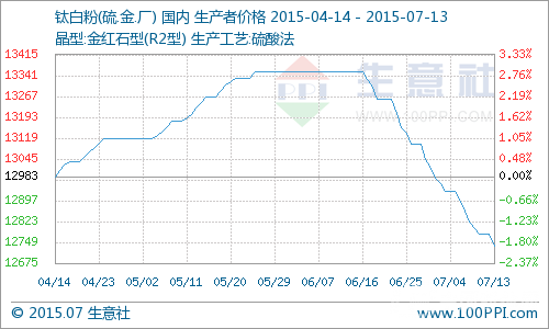 7月12日鈦白粉(硫.金.廠)商品指數(shù)為60.67,與昨日持平,較周期內(nèi)最高點100.00點(2011-09-04)下降了39.33%,較2015年02月02日最低點60.12點上漲了0.91%。(注:周期指2011-09-01至今)