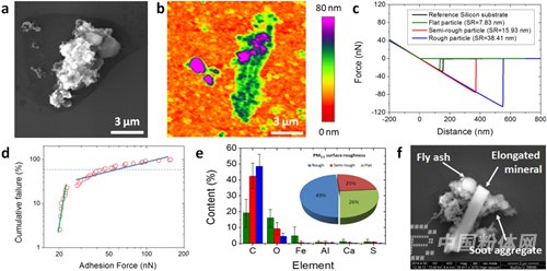 圖:(a) 和 (b) 分別為表面很粗糙的PM2.5煤煙聚集物(soot aggregate)的掃描電子顯微鏡 (SEM) 和原子力顯微鏡 (AFM) 圖。 (c) 為在表面粗糙度不同的顆粒上所做的力-位移曲線。(d) 為顆粒粘附力的威布爾概率圖。數(shù)據(jù)收集于兩組不同的PM2.5顆粒上(分別為表面粗糙低和高的顆粒)。(e) 為顆粒的化學(xué)成分柱狀分布圖。顆粒按表面粗糙度劃分為三類,數(shù)據(jù)通過掃描電子顯微鏡/ X光能量色散譜分析得到。(f) 為一個煤煙聚集物(soot aggregate)將球狀浮塵和長條狀礦物灰塵聚集在一起的例子。