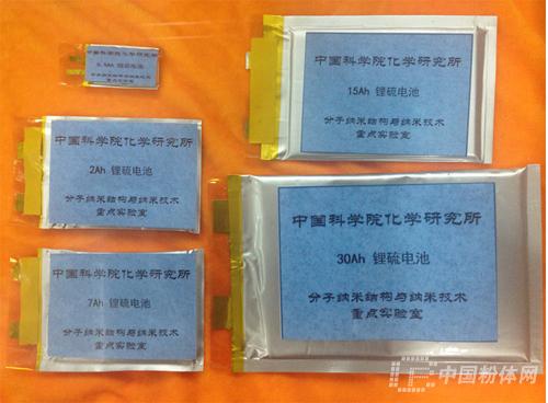 在上述基礎研究的基礎上,研究人員還著力于鋰硫電池工程技術研發(fā)。在中國科學院戰(zhàn)略性先導科技專項“變革性納米制造產業(yè)技術聚焦”項目“長續(xù)航動力電池”的支持下,在化學所建立了鋰硫軟包電池組裝線,鋰硫軟包電池的各項性能指標均取得了重要進展。目前可批量制備單體容量為0.5-30Ah的不同規(guī)格鋰硫軟包電池,其能量密度可達350-450Wh/kg,循環(huán)次數(shù)大于50次。相關鋰硫軟包電池已于9月3日至5日在北京召開的第六屆中國國際納米科學技術會議(ChinaNANO 2015)上展出(圖3)。