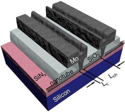 “利用自對(duì)準(zhǔn)技術(shù),我們能以8-10nm間距平行放置碳納米管,”漢述仁透露,“我們用物理氣相沈積(PVD)工藝為其進(jìn)行沉積,然后再用高溫退火——類似于顯微焊接的冶金過(guò)程——以確保兩端的通道觸點(diǎn)穩(wěn)定。”
