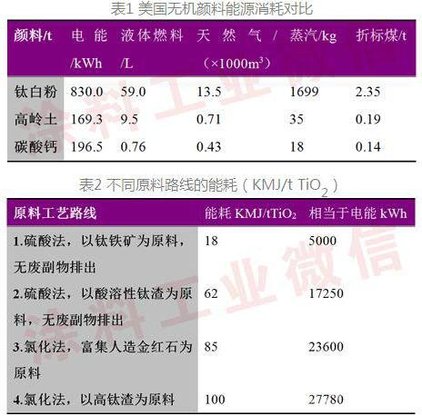 在采用不同原料路線生產(chǎn)時(包括其原料富集生產(chǎn)時的能源消耗)能耗相差比較大,表2為用4種不同原料路線生產(chǎn)鈦白粉時的能源消耗對比。