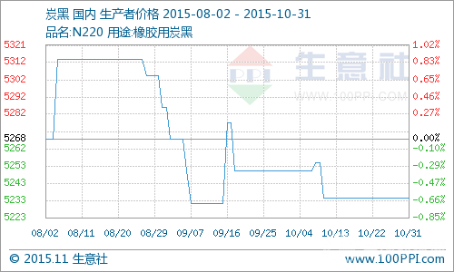 從炭黑價格走勢圖不難看出,炭黑整體走勢是穩(wěn)中有小幅震蕩。十月本該是炭黑的銷售旺季,但整個月下來并未出現(xiàn)拉動炭黑行情走高的利好因素,反而是上游高溫煤焦油持續(xù)弱勢,價格處于歷史低位,降低了炭黑成本;下游對炭黑的需求疲軟不振;近年來我國炭黑產(chǎn)量不斷增加。這些都無疑對炭黑行情產(chǎn)生了一定的打壓。目前炭黑行情能夠穩(wěn)定已是不錯,華東地區(qū)N220報價5400-5850元/噸,華北地區(qū)N220報價4200-5600元/噸,華南地區(qū)N220報價5150元/噸,華中地區(qū)N220報價5000元/噸。