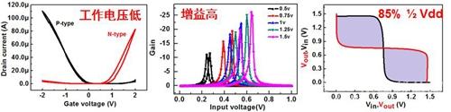 最近,印刷電子學研究部的研發(fā)工作又取得突破性進展。經(jīng)過優(yōu)化構(gòu)建的全印刷柔性薄膜晶體管的電荷遷移率可達到100-400 cm2/Vs,亞閾值擺幅(ss)只有69 mV/dec,是目前已報道的印刷薄膜晶體管中遷移率最高、亞閾值擺幅最小的柔性印刷碳納米管薄膜晶體管器件。構(gòu)建的印刷柔性CMOS反相器也表現(xiàn)出優(yōu)越的性能,在低電壓(1伏)工作下增益可達23,噪聲容限高達85%,也是目前國際上已報道的最好結(jié)果。該工作于2015年10月在臺北召開的第6屆國際柔性與印刷電子年會上(ICFPE 2015)獲“最佳論文獎”。