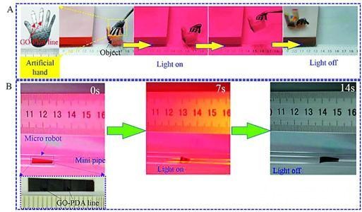A圖:一只石墨烯紙制作的人工手在光源明滅中抓取了小物件。B圖:一個(gè)石墨烯制作的微機(jī)器人在小管中用14秒受控爬行了幾厘米。