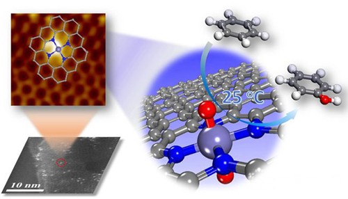 中國粉體網(wǎng)訊 近日,中國科學院大連化學物理研究所催化基礎國家重點實驗室副研究員鄧德會和中國科學院院士包信和帶領的研究團隊在長期研究二維催化材料和納米限域催化的基礎上,成功將FeN4結構限域在納米石墨烯骨架中,并結合多種高分辨探針手段,首次直接觀察到石墨烯內(nèi)嵌FeN4中心的原子結構。該限域結構有效地維持Fe原子配位不飽和狀態(tài),使其具有優(yōu)異的催化活性和穩(wěn)定性,能夠在室溫甚至0oC 高選擇性地催化氧化苯生成苯酚。相關結果近日發(fā)表在《科學進展》上。