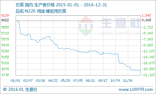據(jù)生意社價格監(jiān)測顯示,2015年初炭黑價格為6022,,2015年末炭黑價格為4878,下跌了18.99%。