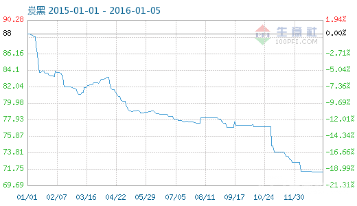 通過生意社商品價格指數(shù)來看,2015年初炭黑商品價格指數(shù)為88,2015年末炭黑商品指數(shù)為71.75,下跌了18.99%。