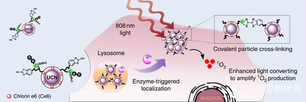 在這項(xiàng)工作中,不同的過程涉及的是非特異性的腫瘤靶向,這樣獨(dú)特的平臺(tái),可以響應(yīng)腫瘤特異性酶并進(jìn)行交聯(lián)反應(yīng),從而促使選擇性腫瘤的積累。更重要的是,這與 不能進(jìn)行交聯(lián)反應(yīng)的粒子相比,酶觸發(fā)共價(jià)交聯(lián)具有增強(qiáng)在808 nm照射時(shí)光轉(zhuǎn)換發(fā)射。這樣的增強(qiáng)可以從負(fù)載在顆粒表面的光敏劑上有效放大活性氧(O2) 的生產(chǎn)。從而在多模態(tài)成像和光動(dòng)力腫瘤治療(PDT)治療惡性腫瘤中,在808 nm照射下表現(xiàn)出獨(dú)特的粒子定位。因此給出了光動(dòng)力腫瘤治療(PDT)以 及體外和體內(nèi)無創(chuàng)熒光和光聲成像的納米藥物的前景。這明確的合理的設(shè)計(jì)可以很容易地?cái)U(kuò)展到其他獨(dú)特的功能材料和開發(fā)新的未來臨床應(yīng)用。