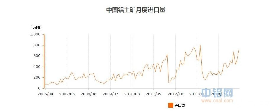 中國粉體網(wǎng)訊 日前中國海關(guān)總署公布2015年12月中國商品進(jìn)出口情況,數(shù)據(jù)顯示12月中國進(jìn)口鋁土礦710.67萬噸,創(chuàng)23個(gè)月新高,并且據(jù)中鋁網(wǎng)統(tǒng)計(jì),近幾年單月鋁土礦進(jìn)口量超過700萬噸只有三個(gè)月,其余兩次分別為2013年9月759.14萬噸和2014年1月801.59萬噸,而這兩次是由當(dāng)時(shí)印尼公布鋁土礦出口禁令所致。
