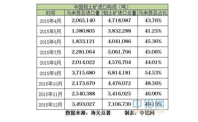 無獨(dú)有偶,12月鋁土礦進(jìn)口數(shù)據(jù)大增也是由鋁土礦出口國的相關(guān)政策所致,中鋁網(wǎng)月初曾報(bào)道,由于擔(dān)憂對(duì)環(huán)境的沖擊,馬來西亞決定暫停開采鋁土礦三個(gè)月,禁令從1月15日生效,這一政策是由馬來西亞天然資源與環(huán)境部長Wan Junaidi Tuanku Jaafar周三在記者會(huì)中公開,他還表示除了清除庫存以及設(shè)置清除庫存所需的設(shè)施之外其他活動(dòng)都將停止,馬來西亞也將凍結(jié)發(fā)放新的鋁土礦出口許可。據(jù)中鋁網(wǎng)統(tǒng)計(jì),從2015年二季度開始中國有超過40%的進(jìn)口鋁土礦來自馬來西亞。
