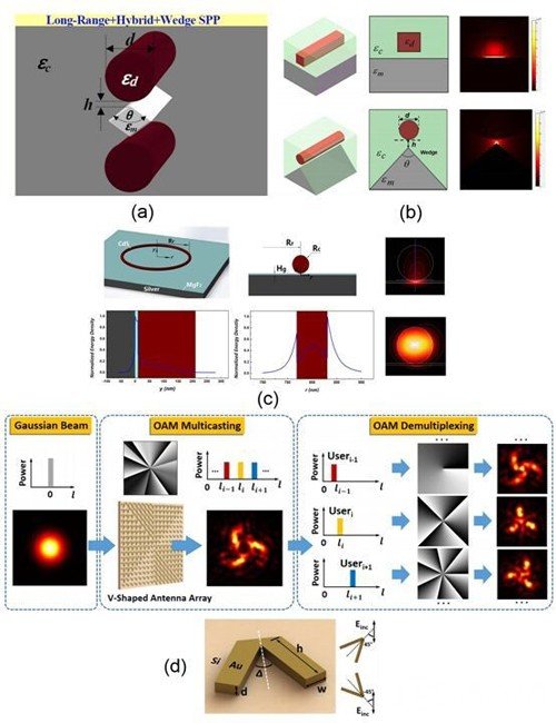 圖1 (a) 設(shè)計(jì)的long-range hybrid wedge plasmonic (LRHWP) waveguide結(jié)構(gòu);(b) 楔形hybrid plasmonic terahertz (THz) waveguide結(jié)構(gòu); (c) 環(huán)形諧振器的三維和二維結(jié)構(gòu)示意圖及模式的能流密度分布;(d) 基于V型天線陣列OAM廣播的概念和原理。