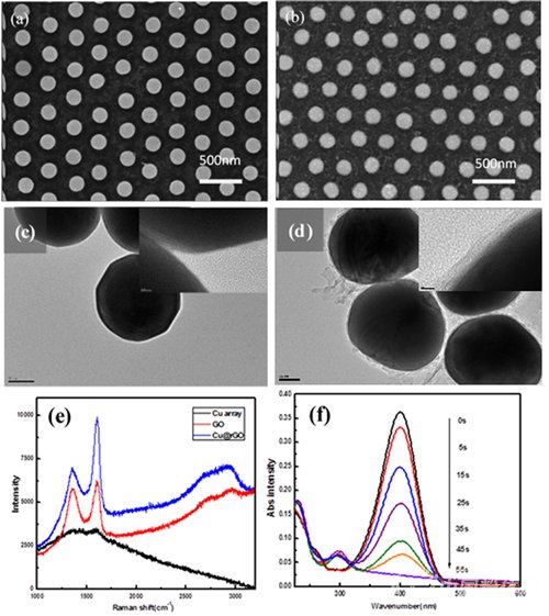 圖(a)與圖(b)分別是銅納米顆粒陣列和石墨烯包覆銅納米顆粒陣列的SEM照片;圖(c)與圖(d)分別是銅納米顆粒陣列和石墨烯包覆銅納米顆粒陣列的TEM 照片;圖(e)從下至上的曲線分別為銅納米顆粒陣列、氧化石墨烯以及石墨烯包覆銅納米顆粒陣列的拉曼圖;圖(f)為石墨烯包覆的銅納米顆粒為催化劑,4-硝基苯酚還原成4-氨基苯酚的過程。