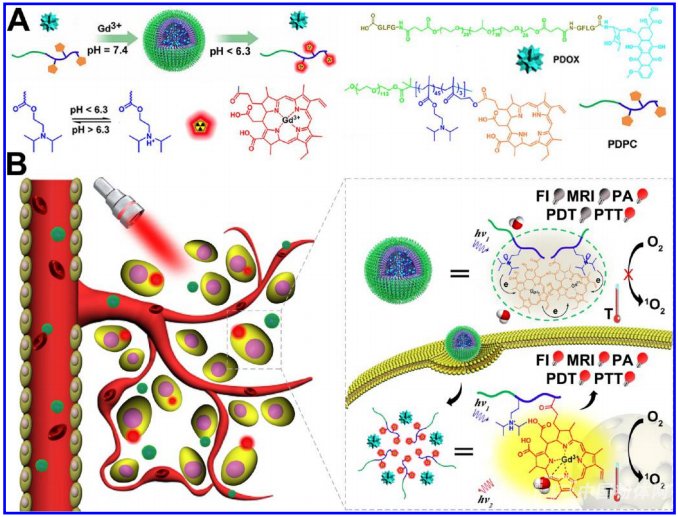 上海藥物所的研究人員應(yīng)用酸敏感聚合物載體、小分子光敏劑Ce6和大分子阿霉素前藥自組裝形成聚合物膠束。納米膠束可在正常生理環(huán)境中(pH 7.4)保持“沉默”,在進(jìn)入腫瘤細(xì)胞溶酶體環(huán)境后(pH≤6.2)實(shí)現(xiàn)酸激活,發(fā)揮多模態(tài)成像和協(xié)同治療作用,并促進(jìn)化療藥滲透殺傷耐藥細(xì)胞。利用Ce6的理化特性,可實(shí)現(xiàn)酸激活的熒光成像和光聲成像,實(shí)現(xiàn)耐藥腫瘤的多模態(tài)成像;而Ce6介導(dǎo)的光熱、光動(dòng)力治療作用可有效增強(qiáng)阿霉素前藥的腫瘤組織穿透能力,與化療作用一起聯(lián)合殺傷耐藥細(xì)胞,克服腫瘤耐藥。在耐受阿霉素的乳腺癌MCF-7/ADR細(xì)胞和活體移植瘤模型上的研究顯示,這種新型納米遞藥系統(tǒng)能夠顯著抑制腫瘤生長(zhǎng),同時(shí)實(shí)現(xiàn)多模態(tài)成像和治療,為克服耐藥腫瘤提供了新思路。