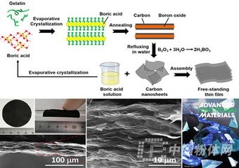 邱介山團(tuán)隊(duì)以生物質(zhì)分子(明膠)為前驅(qū)體,以硼酸為層狀晶體模板,在納米碳薄片內(nèi)原位摻雜引入硼和氮原子,一步法實(shí)現(xiàn)對(duì)納米碳薄片之化學(xué)組成和微觀結(jié)構(gòu)的精細(xì)調(diào)變。此類超大面積納米碳薄片具有優(yōu)異的柔韌性,可作為基本結(jié)構(gòu)基元,基于多尺度自組裝機(jī)制而構(gòu)筑二維柔性自支撐薄膜、三維超輕氣凝膠等。作為超級(jí)電容器電極材料,此類超大面積納米碳薄片及其自組裝構(gòu)筑的二維薄膜宏觀體均表現(xiàn)出高比電容、超長(zhǎng)循環(huán)壽命(15000次)及優(yōu)異的高功率輸出能力;材料制備過(guò)程中的層狀晶體模板(硼酸)可通過(guò)簡(jiǎn)單的溫和綠色化的水洗-蒸發(fā)結(jié)晶工藝循環(huán)利用。該成果發(fā)表在材料科學(xué)領(lǐng)域國(guó)際著名期刊《先進(jìn)功能材料》,并得到國(guó)家自然科學(xué)基金會(huì)的資助支持。
