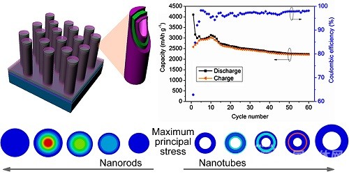圖1c@si@c三維納米管陣列電極示意圖;充放電循環(huán)容量與庫(kù)倫效率;鋰化過(guò)程最大主應(yīng)力分布的建模分析圖