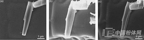 圖2(a)c@si@c納米管sem圖;(b)充電(嵌鋰)和(c)放電(脫鋰)后的in-situsem圖