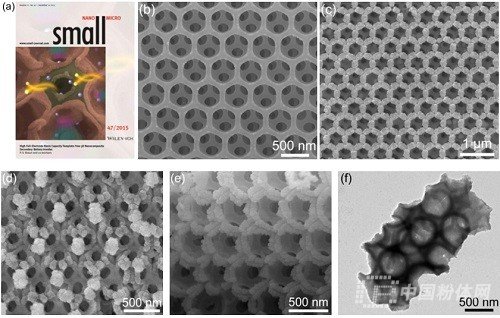 圖3(a)small封面文章;(b)三維結(jié)構(gòu)sio2和(c)sio2@fe3o4/c電極sem俯視圖;fe3o4/c復(fù)合納米電極sem(d)俯視圖和(e)截面圖;(f)tem照片