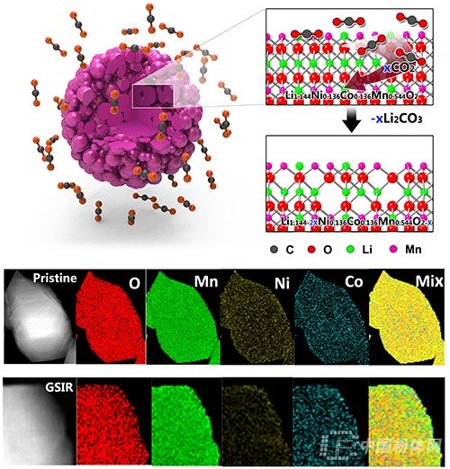 2013年,該研究團(tuán)隊(duì)發(fā)展了一種新穎的氣固界面改性(CN201310416745.1,PCT/CN2013/088597),讓富鋰錳基正極材料顆粒表面形成均勻氧空位,從而大大提高了該材料的首次充放電效率、放電比容量和循環(huán)穩(wěn)定性。此后,他們與國(guó)內(nèi)外多個(gè)研究團(tuán)隊(duì)合作和協(xié)同創(chuàng)新,利用各種先進(jìn)的分析表征手段和理論計(jì)算,研究了氧空位存在下的鋰離子脫嵌機(jī)制。其中,布魯克海文國(guó)家實(shí)驗(yàn)室(BNL)教授朱溢眉、吳力軍等利用先進(jìn)透射電鏡觀察到氧空位,加州大學(xué)圣地亞哥分校(UCSD)教授孟穎課題組利用橡樹嶺國(guó)家實(shí)驗(yàn)室的中子衍射證明了晶格氧空位的存在,德國(guó)明斯特大學(xué)博士王軍利用原位電化學(xué)氣相質(zhì)譜研究了充放電過程中晶格氧的變化,邱報(bào)利用上海同步輻射光源的X射線衍射/吸收光譜證明了氧空位并不改變材料晶體結(jié)構(gòu),孟穎課題組博士張明浩還通過DFT理論計(jì)算發(fā)現(xiàn)氧空位提高了材料晶格氧的活性。該研究工作發(fā)表在Nature Communications 2016, 7, 12108,得到了審稿人的高度評(píng)價(jià)。該工作首次提出了通過提高晶格氧的活性來(lái)改善富鋰錳基正極材料的首次充放電效率和倍率性能,為該材料改性研究提供了新思路。此外,該氣固界面改性方法相對(duì)簡(jiǎn)單、可控且易實(shí)現(xiàn)工程化,這為高性能富鋰錳基正極材料的工程化開發(fā)提供了新途徑。目前,該研究團(tuán)隊(duì)正在利用此改性方法著力推進(jìn)富鋰錳基正極材料的中試開發(fā)。