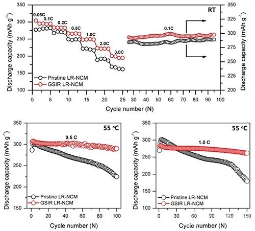 圖2. 富鋰錳基正極材料改性前后的電化學(xué)性能