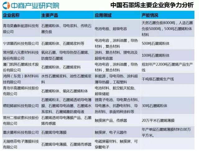 四、中國石墨烯企業(yè)競(jìng)爭力分析 我國石墨烯企業(yè)已超過百家,并在常州、無錫、青島、深圳等地形成產(chǎn)業(yè)集群,從產(chǎn)品上來看,其生產(chǎn)產(chǎn)品大多數(shù)作為石墨烯電池的導(dǎo)電劑、涂料、導(dǎo)熱膜使用在這些企業(yè)中,中小型、初創(chuàng)型企業(yè)占比較大,中型、大型企業(yè)相對(duì)較少。中端單層高純度小尺寸石墨烯逐漸實(shí)現(xiàn)小規(guī)模生產(chǎn),單層高純度大尺寸石墨烯還處于研發(fā)初期階段,這些高端石墨烯應(yīng)用于更先進(jìn)的電池生產(chǎn),可以解決電池使用壽命短、容量低、成本高等技術(shù)障礙。 目前國內(nèi)從事石墨烯電池的粉體材料研發(fā)、生產(chǎn)的公司主要有寧波墨西、常州第六元素、常州二維碳素、廈門凱納、鴻納新材料、德陽烯碳等。石墨烯薄膜國內(nèi)龍頭企業(yè)有常州二維碳素、無錫格菲、重慶墨希(華麗家族)等。單層或多層小規(guī)格石墨烯小規(guī)模生產(chǎn)的有東旭光電旗下的碳源匯谷等。