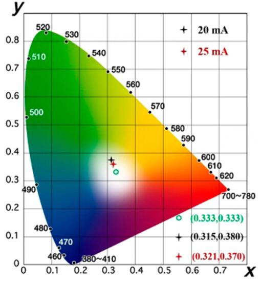 測試結(jié)果表明,作為發(fā)光器件,其光線的顯示范圍非常接近于自然光(圖中綠色點(diǎn)),作為半導(dǎo)體器件,其穩(wěn)定性也較好,在測試的兩個(gè)月期間,幾乎沒有性能下降。