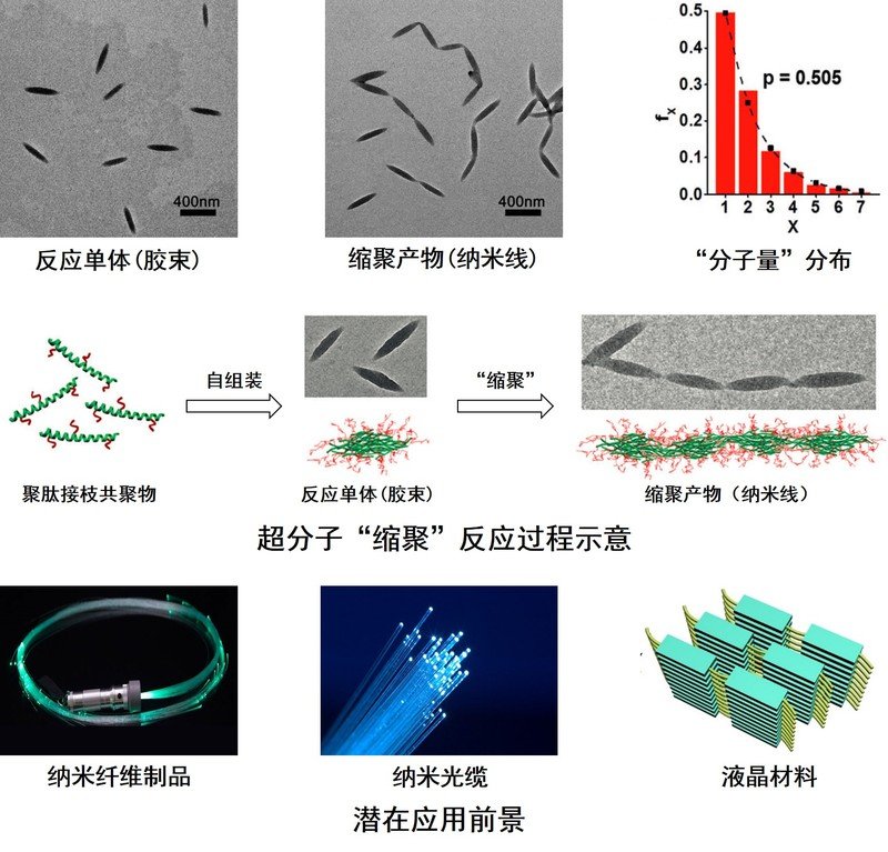 納米級的聚集體,如膠束等,通過特定的方法產(chǎn)生反應(yīng)活性點后,可發(fā)生“縮聚”反應(yīng),形成納米線狀的鏈?zhǔn)匠肿印熬酆衔铩。這一發(fā)現(xiàn)提供了一種制備多級結(jié)構(gòu)納米材料的新方法。該方法具有普適性和可控性,其意義在于將高分子縮聚反應(yīng)的范疇擴(kuò)展至納米尺度。研究表明,超分子“縮聚”反應(yīng)并非局限于某一特定的聚合物,而是普適于多數(shù)含有剛性鏈段的共聚物系,“縮聚”得到的多級組裝體,其結(jié)構(gòu)和尺寸具有可控性。因此,超分子“縮聚”反應(yīng)展現(xiàn)出較為廣闊的應(yīng)用前景,可用于精確制備具有多級結(jié)構(gòu)的納米器件,提升功能性納米材料的尺度,如光電納米線、納米電纜和智能響應(yīng)型載藥體等。通過該超分子“縮聚”反應(yīng),還有望制備各類超材料,如超強(qiáng)度液晶等,用于航空航天領(lǐng)域。