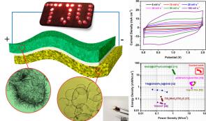爾后,課題組利用納米多孔銅催化氫化石墨高溫裂解,合成了連續(xù)異質(zhì)結(jié)構(gòu)的納米多孔石墨烯膜(3D-npG),并以此為負(fù)極材料,3D-DG@MnO2為正極材料,PVA/LiNO3為凝膠電解質(zhì),組裝成非對(duì)稱柔性超電容(ASCs)。組裝后的ASCs的厚度僅有50μm左右,電壓窗口可擴(kuò)展至2V,表現(xiàn)出優(yōu)異的體積能量密度(28.2 mWh cm-3)和功率密度(55.7 W cm-3)。ASCs在循環(huán)5000次之后容量仍然能夠保持在~92%。僅使用一片ASCs就可以同時(shí)點(diǎn)亮25盞紅色LED燈。