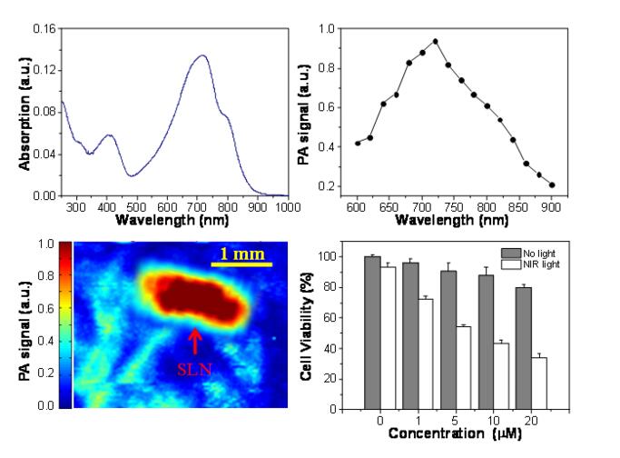 該納米顆粒展示了優(yōu)秀的光聲信號(hào)產(chǎn)生能力,并在大鼠前哨淋巴結(jié)的實(shí)時(shí)活體成像中呈現(xiàn)了良好的分辨率和成像深度。同時(shí),該納米顆粒在近紅外區(qū)域的較大的摩爾吸光系數(shù)以及極弱的熒光發(fā)射,使其具有良好的光熱轉(zhuǎn)化效率。體外細(xì)胞實(shí)驗(yàn)證實(shí)了其能有效地殺滅癌細(xì)胞,展現(xiàn)了它在腫瘤光熱治療中的應(yīng)用潛力。