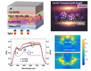 香港大學(xué)電子電機(jī)工程系蔡植豪(W.C.H. Choy)教授課題組和中國(guó)科學(xué)院化學(xué)研究所侯建輝研究員課題組利用納米金星顆粒的等離子體非對(duì)稱模式同時(shí)實(shí)現(xiàn)有機(jī)太陽能電池光學(xué)和電學(xué)兩方面性能的提高,取得10.5%的光電轉(zhuǎn)換效率。