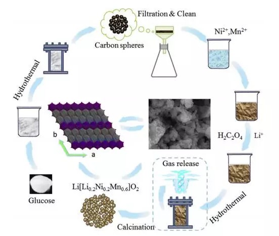 Linjing Zhang利用兩步水熱法合成了Li[Li0.2Ni0.2Mn0.6]O2材料,該方法主要包含兩個步驟,第一步利用葡萄糖在180℃下水熱法合成碳微球,作為第二部模板。在第二步水熱法合成過程中,以Ni和Mn的醋酸鹽作為原料,在450℃下合成富鋰材料,通過在其中添加不同的數(shù)量的第一步過程所合成的碳微球來改善富鋰材料Li[Li0.2Ni0.2Mn0.6]O2的形貌結(jié)構(gòu),這些添加的碳微球模板在后續(xù)的燒結(jié)過程中會發(fā)生分解,從而不會殘存碳材料。