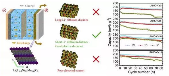 研究發(fā)現(xiàn),當碳微球的添加量過少時,反而會造成富鋰材料的納米顆粒發(fā)生團聚,而碳微球過多時則會造成材料的顆粒過于松散,添加10wt%碳微球的富鋰材料具有最好的循環(huán)性能、倍率性能和最少電壓衰降。