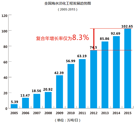 據(jù)中國水網(wǎng)報道,2012至2015年,全國海水淡化工程規(guī)模復合年增長率僅為8.3%。發(fā)展意見中的一系列量化目標:包括到2015年,海水淡化能力達到220萬-260萬噸/日,對海島新增供水量的貢獻率達50%以上,對沿海缺水地區(qū)新增工業(yè)供水量貢獻率達15%以上,海水淡化原材料、裝備制造自主創(chuàng)新率達70%以上等等,都沒有實現(xiàn)。