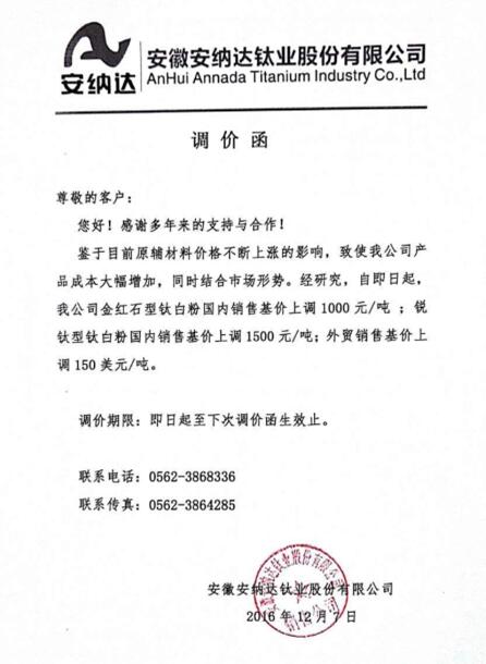 安徽安納達鈦業(yè)發(fā)布調價函,公司金紅石型鈦白粉國內銷售基價上調1000元/噸,銳鈦型鈦白粉國內銷售基價上調15000元/噸。外貿銷售基價上調150美元/噸。調價期限:從即日起至下次調價函生效止。