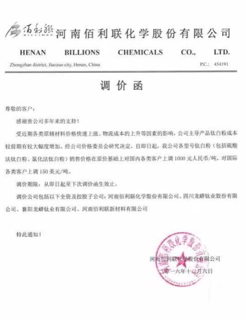 中國粉體網(wǎng)訊 12月6日,河南佰利聯(lián)發(fā)布調價函,公司各型號鈦白粉(硫酸法鈦白粉、氯化法鈦白粉)銷售價格在原價基礎上對國內各類客戶上調1000元/噸,對國際各類客戶上調150美元/噸。調價期限:從即日起至下次調價函生效止。