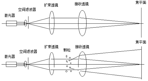 如下圖所示,當(dāng)通過(guò)某種特定的方式把顆粒均勻地放置到平行光束路徑中時(shí),激光束經(jīng)過(guò)顆粒時(shí)將發(fā)生衍射或散射現(xiàn)象,一部分光將與光軸成一定的角度向外擴(kuò)散。米氏散射理論證明,大顆粒引發(fā)的散射光與光軸之間的散射角小,小顆粒引發(fā)的散射光與光軸之間的散射角大。這些不同角度的散射光通過(guò)富氏透鏡后匯聚到焦平面上將形成半徑不同明暗交替的光環(huán),這些不同半徑的光環(huán)包含著粒度和含量的信息。在焦平面上沿徑向安裝一系列光電接收器,將光信號(hào)轉(zhuǎn)換成電信號(hào)并傳輸?shù)接?jì)算機(jī)中,再用專(zhuān)用軟件進(jìn)行分析和識(shí)別這些信號(hào),就可得到粒度分布。