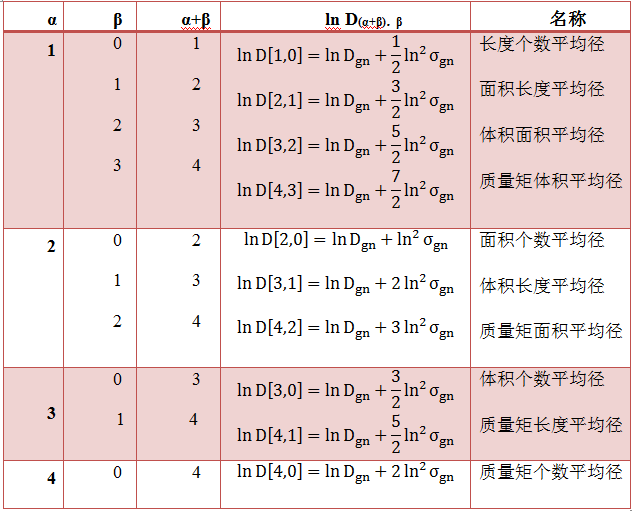 表中:0代表個(gè)數(shù),也用符號(hào)n;1代表長(zhǎng)度,也用符號(hào)l;2代表面積,也用符號(hào)S;3代表體積,也用符號(hào)V;4代表質(zhì)量矩,也用符號(hào)M。Dgn是個(gè)數(shù)基準(zhǔn)幾何平均徑,σgn是幾何標(biāo)準(zhǔn)偏差。