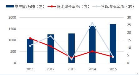 圖2中國“十二五”期間涂料產(chǎn)量變化
