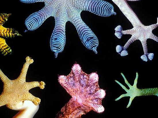 當(dāng)壁虎把它們的腳掌貼在墻壁表面時,腳趾上數(shù)百萬個剛毛(微小的頭發(fā)狀結(jié)構(gòu))的原子與墻壁原子相互作用。產(chǎn)生化學(xué)鍵使電子重新排列,在腳掌與墻壁之間產(chǎn)生被稱為“范德華力”的電吸力。