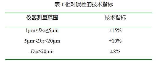 2) 測(cè)量相對(duì)誤差:對(duì)粒度標(biāo)準(zhǔn)物質(zhì)的D50測(cè)量時(shí),儀器測(cè)量值與粒度標(biāo)準(zhǔn)物質(zhì)的標(biāo)稱值間的相對(duì)誤差不大于表1中所列技術(shù)標(biāo)準(zhǔn):