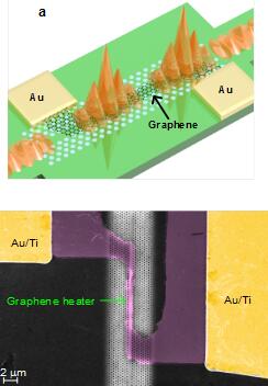 來自華中科技大學武漢光電國家實驗室和丹麥技術大學的科研人員通過對集成光子器件的調控問題進行長期實踐與探索后認為,將石墨烯與慢光效應相結合是解決這個問題的一個有效方案。作為一個近年來頻繁出現(xiàn)在人們視線中的熱門詞匯,石墨烯因為其所具有的許多獨特而又奇異的物理性質,成為了科學界和產業(yè)界追逐的焦點。石墨烯由碳原子按照呈蜂巢型六角晶格排列構成,它是一種只有一個原子厚度的二維特殊材料。因此,它有著許多其他常規(guī)材料所不具備的特殊物理性質,例如,它幾乎是透明的,只吸收2.3%的光;它的導熱系數(shù)高達5300 W/m·K,是迄今為止導熱性最好的材料之一。這兩個極為優(yōu)良特性意味著它可能是傳統(tǒng)金屬熱電極的最佳替代者。因為相比于傳統(tǒng)的金屬電極,由于石墨烯對光極低的吸收率,使得石墨烯作為熱電極可以緊緊的貼合在光波導的表面,而幾乎不用考慮石墨烯對光的吸收所帶來的損耗,避免了氧化層帶來的熱能損耗;同時,石墨烯極高的導熱系數(shù)意味著它能以極快的速度將熱運送至光波導上,使得調控速度大大提高。