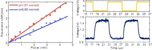 基于以上的理論支持,武漢光電國家實驗室的張新亮教授團隊成員董建績教授和丹麥技術大學(DTU)丁運鴻博士、Asger Mortensen教授開展合作研究,制作出了慢光增強的石墨烯熱電極器件。器件的測試結果顯示(圖2),慢光增強的石墨烯器件的熱調效率高達1.07 nm·mW-1,相比于無慢光增強的器件提高了近一倍,使得光信號達到2p相移所需的能耗僅為3.99 mW,低于絕大多數(shù)傳統(tǒng)工藝制作的金屬熱電極的能耗;同時,光信號開關速度快至550 ns,相比于傳統(tǒng)的金屬熱電極的調制速度加快了近3個數(shù)量級,是迄今所報道的調控速度最快的納米熱電極。