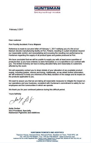 以上是亨斯邁英國向客戶發(fā)出的不可抗力通知函,大意是說:亨斯邁芬蘭波里鈦白工廠2月1日發(fā)生不可抗失火事件,由此導致亨斯邁無法合理控制工廠運轉(zhuǎn),迫使其無法保障在波里工廠所生產(chǎn)的各類型和級別的產(chǎn)品供應(yīng)。