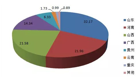氧化鋁產(chǎn)業(yè)具有明顯的資源導(dǎo)向特性,主要分布在鋁土礦資源豐富的河南、山西、廣西、貴州四地,2015 年合計產(chǎn)量占全國總產(chǎn)量的 64.21%。產(chǎn)能出現(xiàn)明顯的分布不均勻現(xiàn)象,不均勻現(xiàn)象導(dǎo)致國內(nèi)氧化鋁企業(yè)兼并重組、債務(wù)重組、轉(zhuǎn)型轉(zhuǎn)產(chǎn)等發(fā)展較慢。