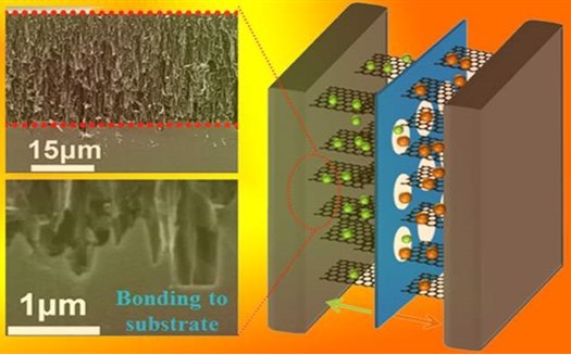 研究人員利用高溫?zé)峤釹iC基底方法制備出高堆疊密度、高導(dǎo)電、單一取向的站立石墨烯陣列。與傳統(tǒng)電極材料相比,該陣列直接生長(zhǎng)在導(dǎo)電SiC基底上,在電極材料與集流體之間形成較強(qiáng)的界面鍵合作用,并建立了有效的離子和電子傳輸通道。電解液離子可沿著站立石墨烯平面無(wú)障礙快速移動(dòng),有效縮短了電解液離子路徑,同時(shí),電子從石墨烯平面到集流體實(shí)現(xiàn)了快速傳輸及其存儲(chǔ)。采用該陣列的微型超級(jí)電容器在凝膠和離子液體電解液中均表現(xiàn)出較高的面容量、快速的頻率響應(yīng)(9毫秒)、優(yōu)異的循環(huán)穩(wěn)定性以及超高掃描速率(200V/s)。該超級(jí)電容器功率密度達(dá)到61W/cm3,理論上可為小型化、集成化電子設(shè)備提供足夠的峰值功率。上述工作為發(fā)展強(qiáng)界面鍵合電極材料應(yīng)用于高功率超級(jí)電容器提供了新方法。