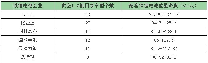 在前兩批新能源客車目錄的配套電池企業(yè)中,CATL的磷酸鐵鋰電池系統(tǒng)最高達到137.27Wh/kg的能量密度,甚至超過許多三元電池系統(tǒng)的能量密度。從公布的目錄來看,系統(tǒng)能量密度達到最高補貼標準的電池企業(yè)只有CATL、北京國能電池、天津力神、微宏動力以及江蘇金陽光幾家,其余配套電池企業(yè)均未達到最高標準。
