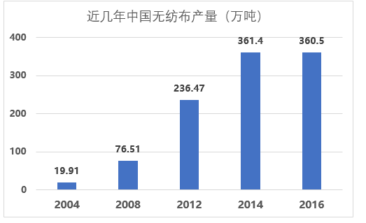 從上圖可以看出,我國(guó)無(wú)紡布產(chǎn)量從2004年的19.9萬(wàn)噸增長(zhǎng)至2012年的236.47萬(wàn)噸,2016年我國(guó)無(wú)紡布產(chǎn)量達(dá)到360.5萬(wàn)噸。