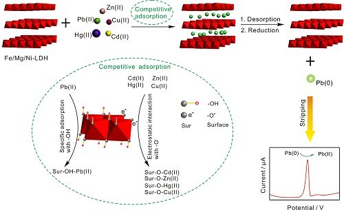 重金屬離子在Fe/Mg/Ni插層材料表面的作用方式和實現(xiàn)對Pb(II)選擇性檢測的示意圖